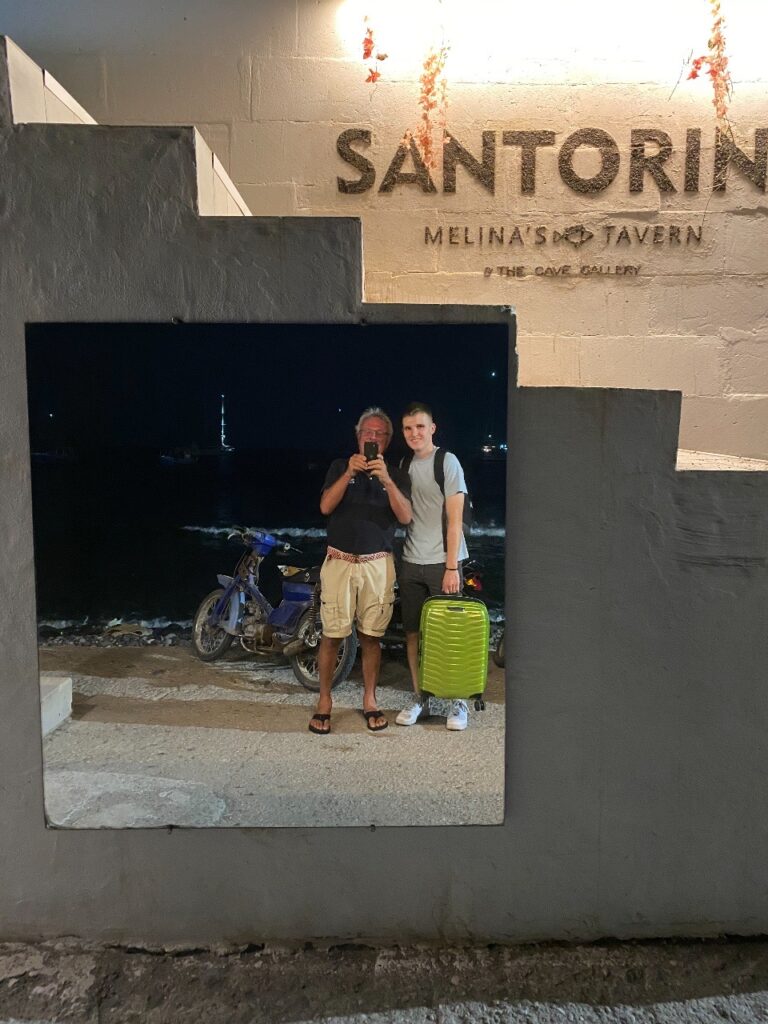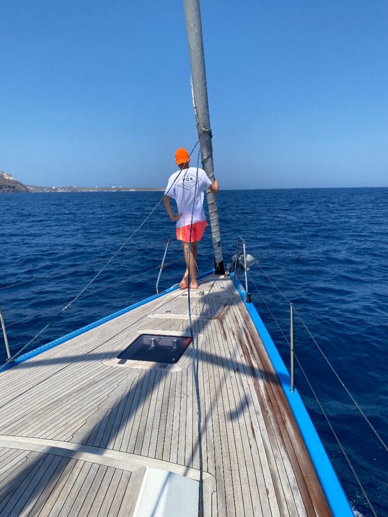 Um 23 Uhr kommt endlich mein Enkelsohn Noah in Akrotiri an, wo wir eine langjährige Tradition, die Opawoche, fortsetzen. Viele Jahre verbringen wir jetzt schon eine Woche zu zweit auf der Ganymed. Nach einem kurzen Paschler herrscht Bettruhe. Der erste gemeinsame Schlag führt am nächsten Morgen nach Vathy auf Folegandros. Der Start unter Genua stellt sich bald als zu optimistisch heraus, weil schon nach wenigen Meilen der Wind über 30 Knoten erreicht, die Genua geborgen und die restliche Strecke unter Motor bewältigt wird.