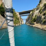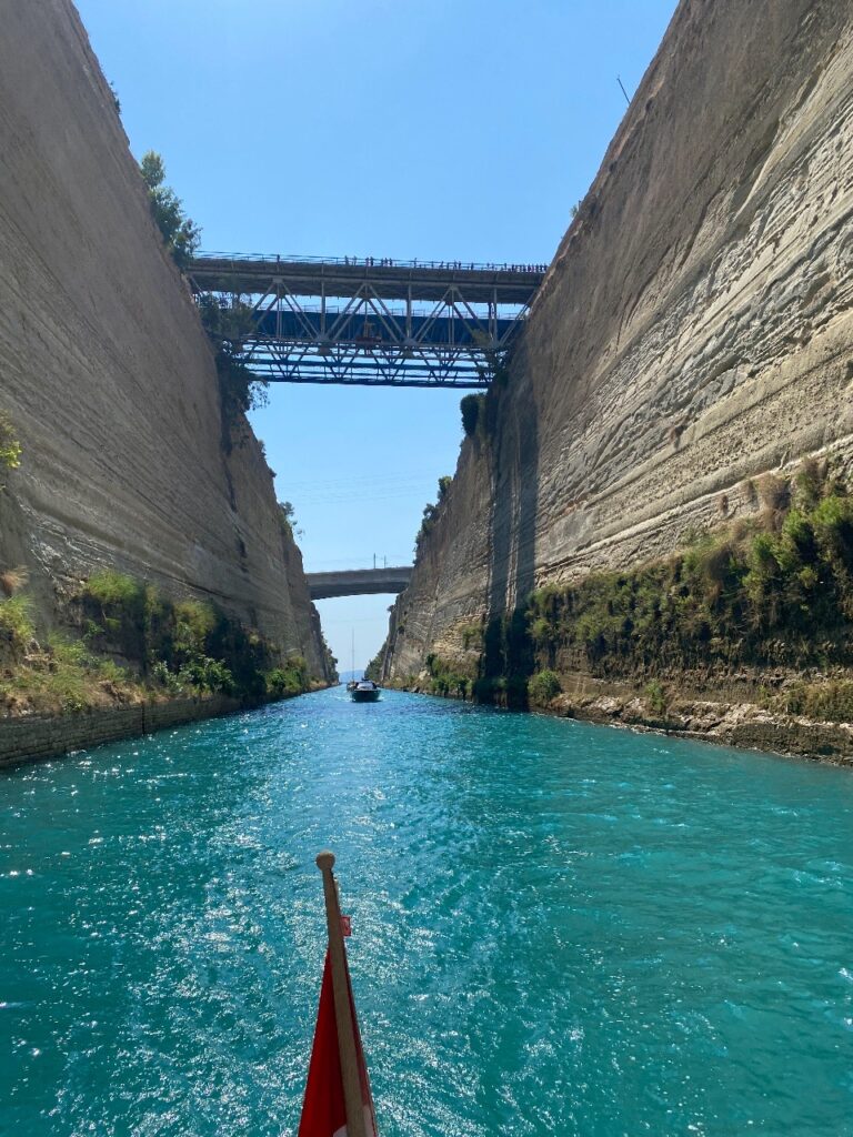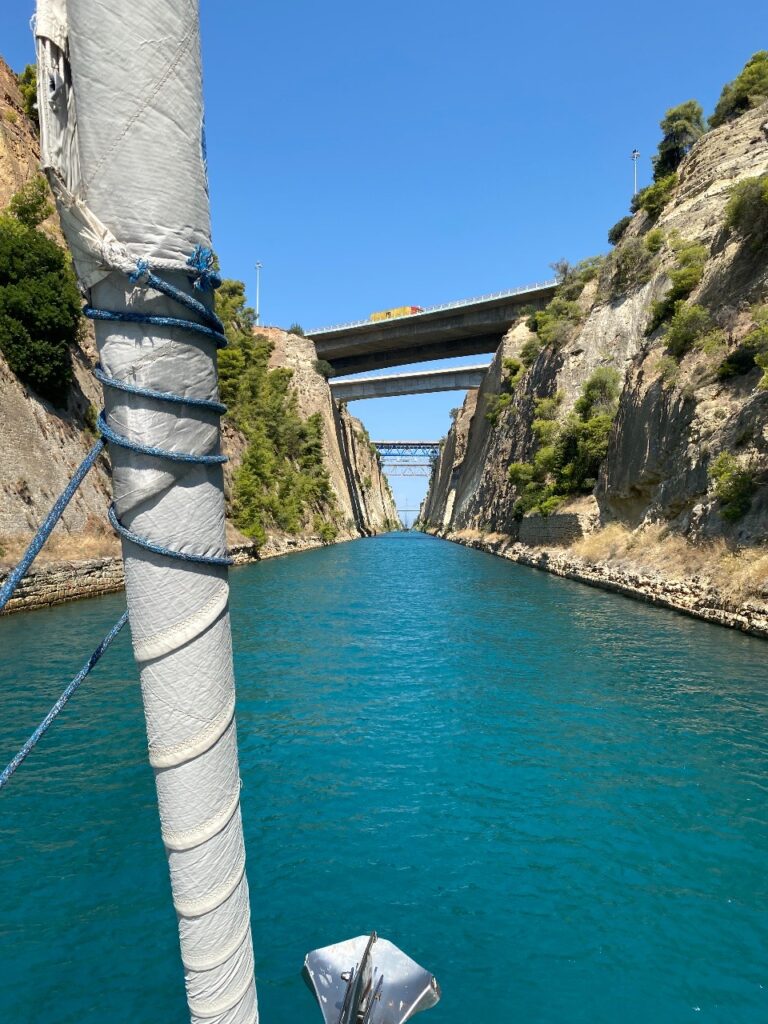 Am Samstag löst Ulli Noah ab. Die ersten drei Tage werden wir längere Schläge machen müssen, bevor die Inseln und Liegeplätze im Ionischen Meer wieder enger zusammenliegen. Gleich 38 Meilen sind es bis zum Osteingang des Kanals von Korinth. In der Bucht Kalamakiou übernachten wir, bevor es am Montag durch den Kanal geht. Mit 250 € erkaufen wir uns dieses Erlebnis. Heute ist uns der Wind nicht hold, nur acht von 45 Meilen lassen sich segeln, um abends im Hafen Itea anzulegen. Der bescheidene, aber sichere Hafen, nimmt uns für 9,07 € pro Nacht auf. Im Ort lässt es sich gut einkaufen.