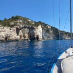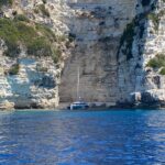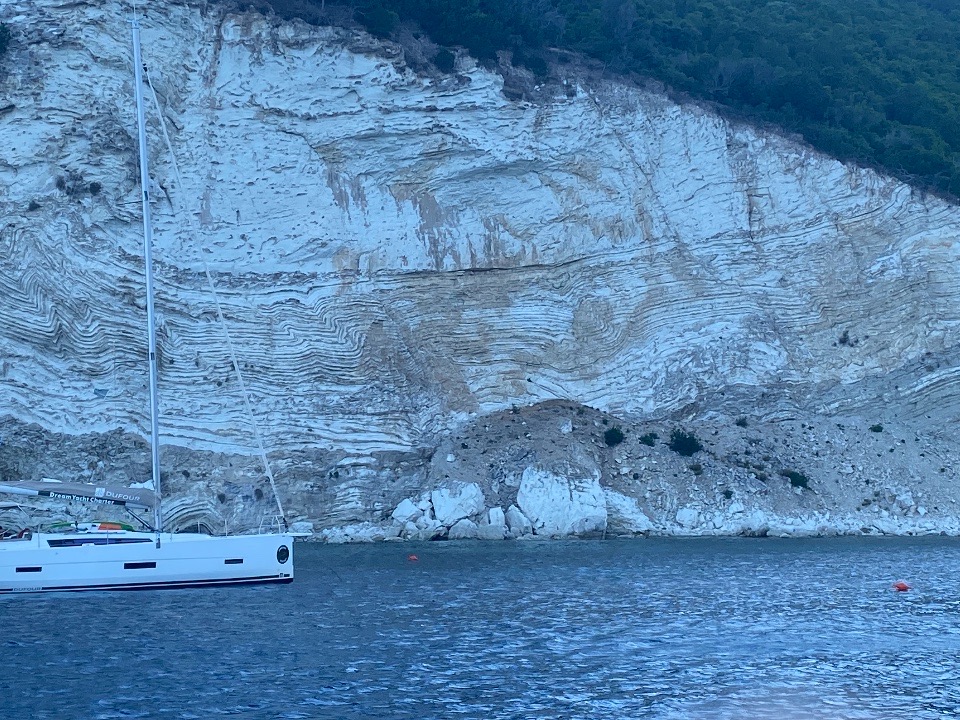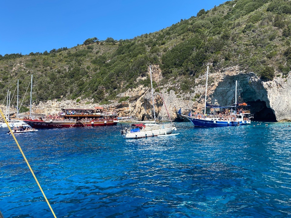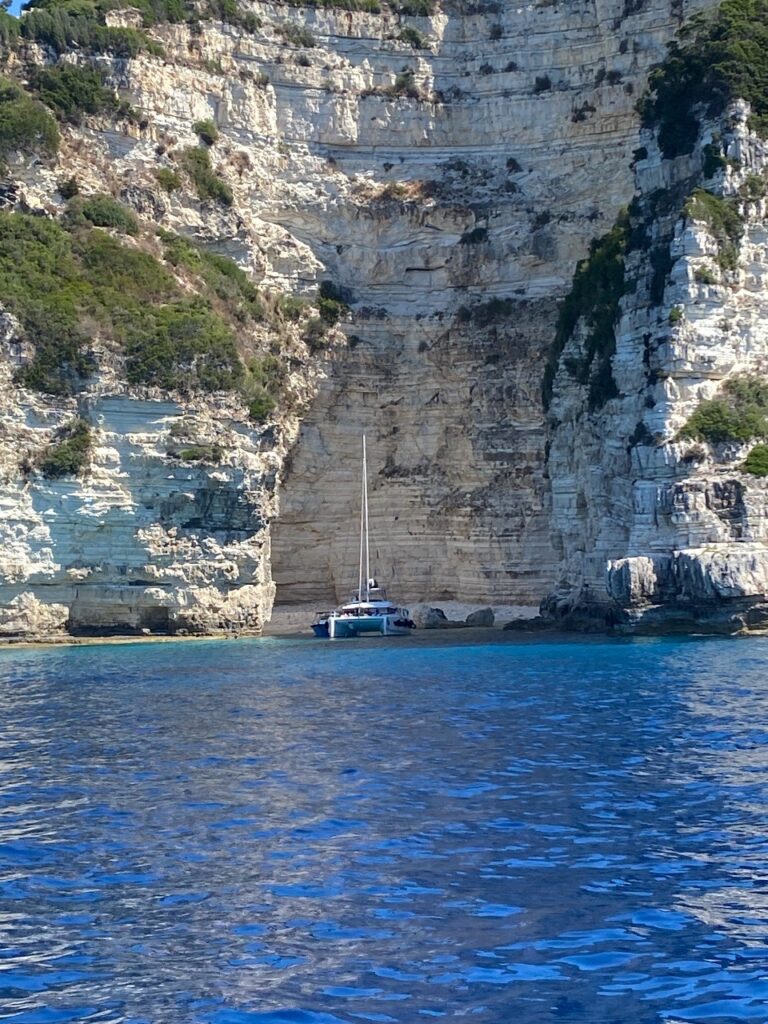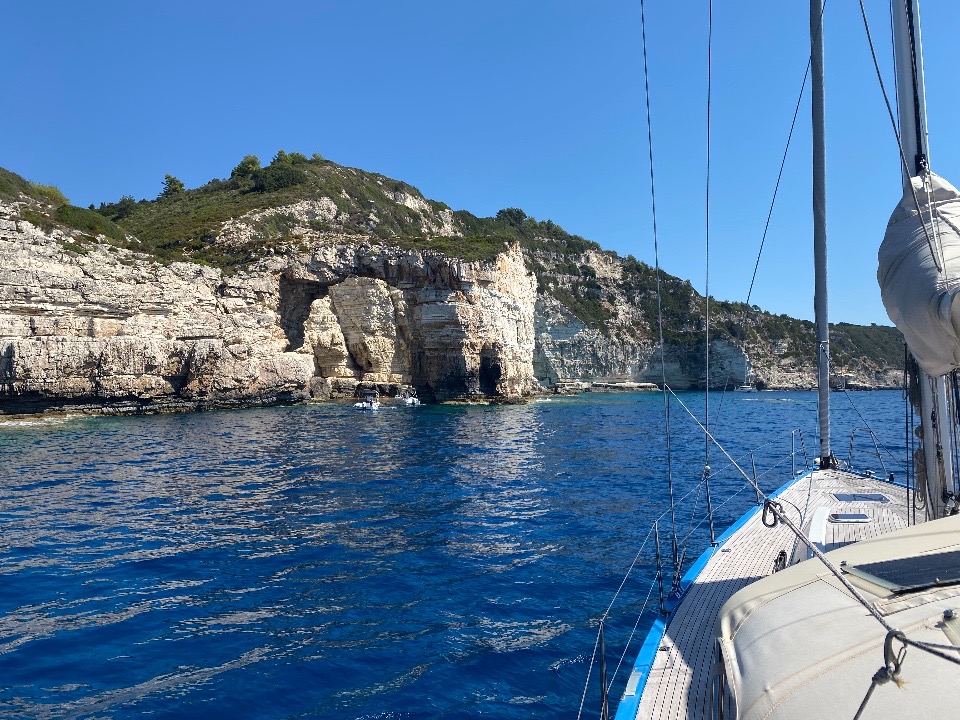 Es bleibt noch ein Tag Zeit, bevor Gouvia am Plan steht. Wir nutzen ihn, um über die Westküste von Paxi in den Norden, nach Lakka, zu fahren. Die Küste ist sensationell schön, mit vielen schroffen Felsformationen und Grotten. Natürlich gibt es auch hier eine „Blaue Grotte“. Trotz der vielen, dort ankernden Auflugsboote und Privatyachten, verbringen auch wir hier unsere Mittagszeit.