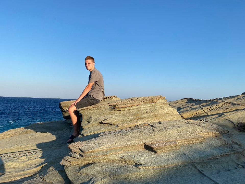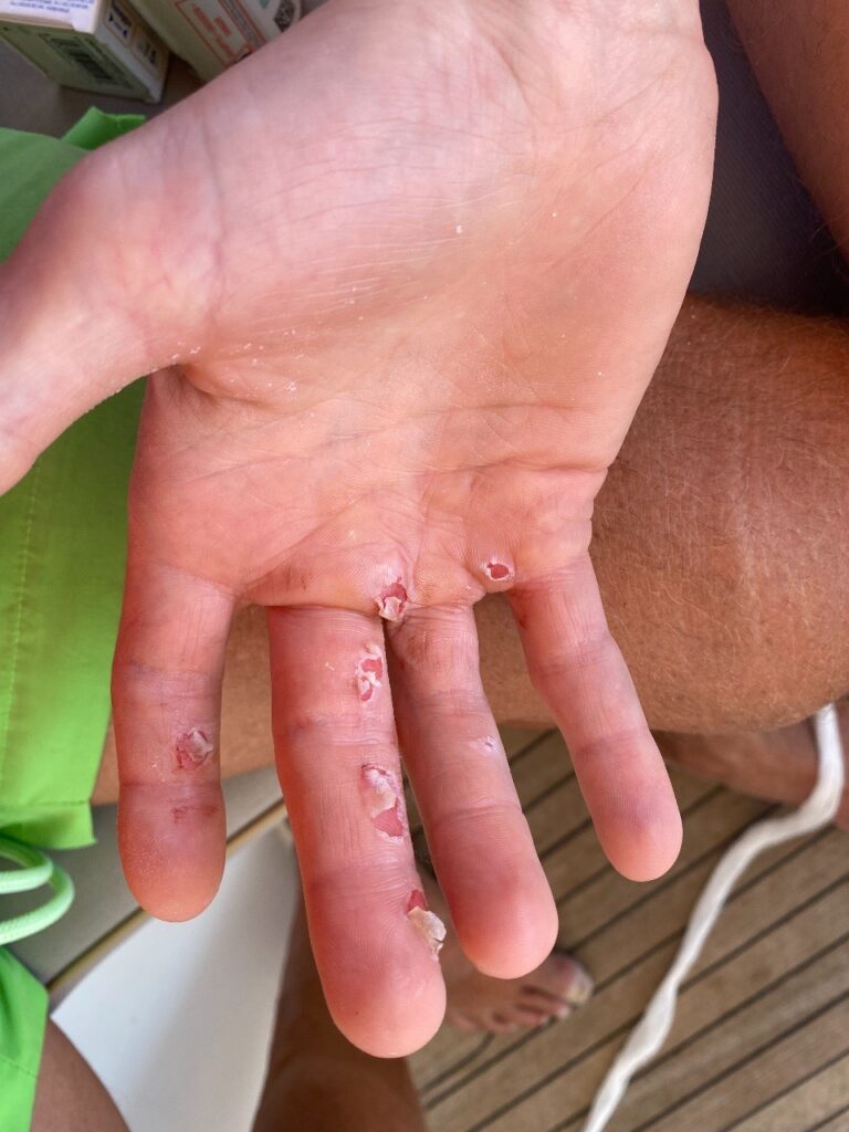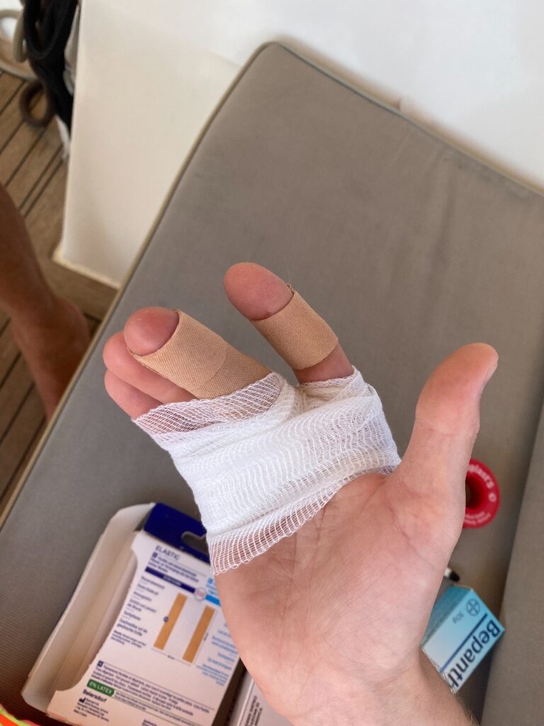 Am Montag ist Sifnos angesagt. Wieder sieht es zuerst nach Genua aus, wieder erwischt es uns eiskalt nach wenigen Meilen. Noah gerät die Genuaschot beim Bergen des Segels außer Kontrolle, einige Brandblasen an der rechten Hand sind das traurige Ergebnis. Leider war das meine Schuld, denn ich hätte ihn vor den enormen Kräften warnen sollen, die beim Auffieren der Genua entstehen. Noch auf See versorgen wir die Wunden provisorisch, um sie in der Ormos Faros auf Sifnos „professionell“ zu versorgen. Der abendliche Spaziergang in die nächste Bucht und das anschließende Dinner in Faros lindern die Leiden. Die Nacht am Anker ist unruhig wegen der starken Fallböen, die mit bis zu 30 kn über uns herfallen.