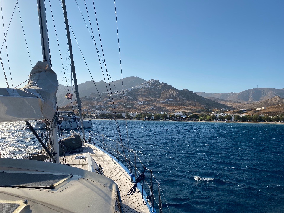 Am Dienstag wollen wir klüger sein und starten gleich mit der Fock, müssen aber bald feststellen, dass der Vortrieb nicht zufriedenstellend ist, der Motor die bessere Alternative darstellt. Erst kurz vor Livadi auf Serifos findet der Meltemi zu seiner vollen Stärke.In der „geschützten“ Bucht warten 25 bis 30 Knoten Wind auf uns, der Anker genießt unser Vertrauen, sodass ein Abendessen an Land möglich wird.