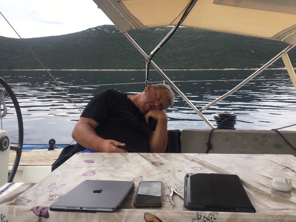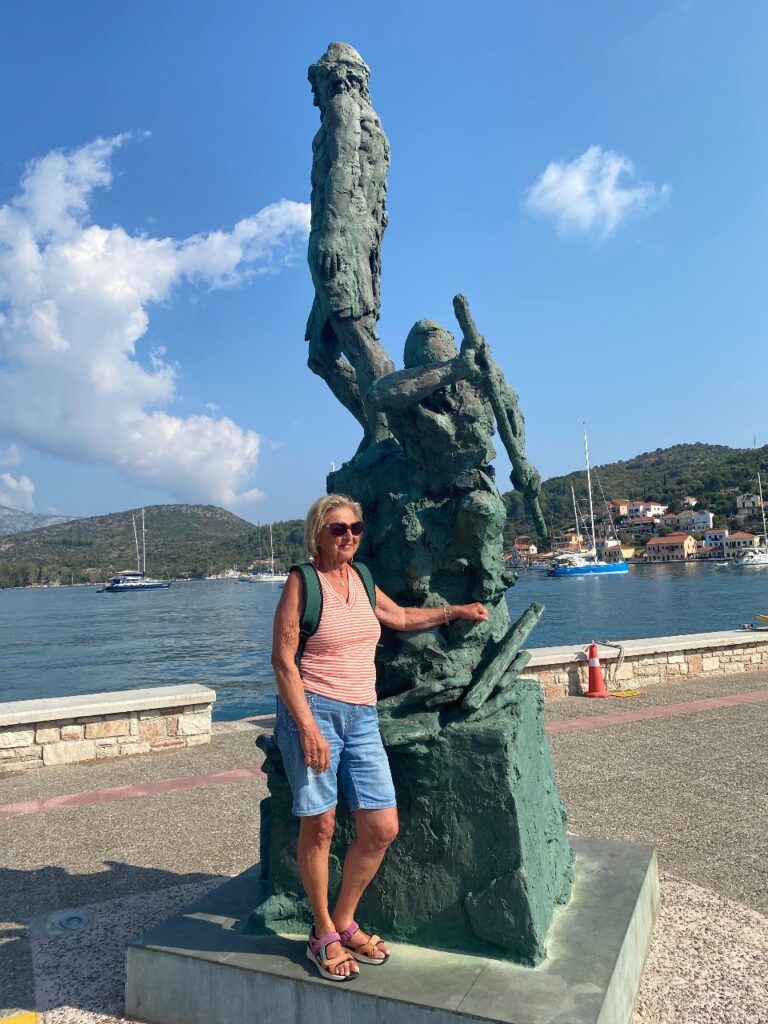 Freitag, der 22. August, Skippers Geburtstag. Einige Gratulanten melden sich, nur der Wind bemüht sich nicht besonders. Nur unter Genua bemühen wir uns nach Ithaki. In Vathi war ich heuer schon einmal mit Stoffi. Am Samstagmorgen bemühe ich mich bei einem Friseur um einen Termin zum Haareschneiden in seinem Designerloft, leider ist er ausgebucht. Da wir es nicht besonders eilig haben, motoren wir nur nach Kioni, das ebenfalls auf Ithaki liegt. Im dortigen Hafen wird landesüblich mit Anker und Heckleinen angelegt. Im blitzsauberen Ort finden sich viele Tavernen und kleine Läden.