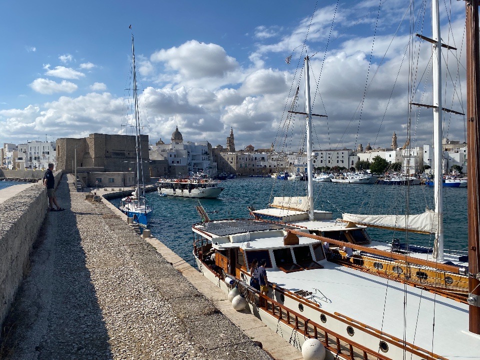 Der Südost bläst auch, wider jede Vorhersage, am Dienstag kräftig. Die wenigen Meilen nach Bisceglie absolvieren wir unter Genua. Franz hat hier überwintert und will uns mit Hilfe seines italienischen Freundes Natale die Stadt zeigen. Der Wind hat auf Ost gedreht als wir am Mittwoch mittag ablegen, um nach Bari zu segeln. In der Marina „A Vele Spiegate“ haben wir reserviert. Nach Monopoli, wo wir in der Marina übernachten, steht Brindisi am Programm. Von hier aus fliegt Franz nach Triest, um sich mit seiner Frau zu treffen.