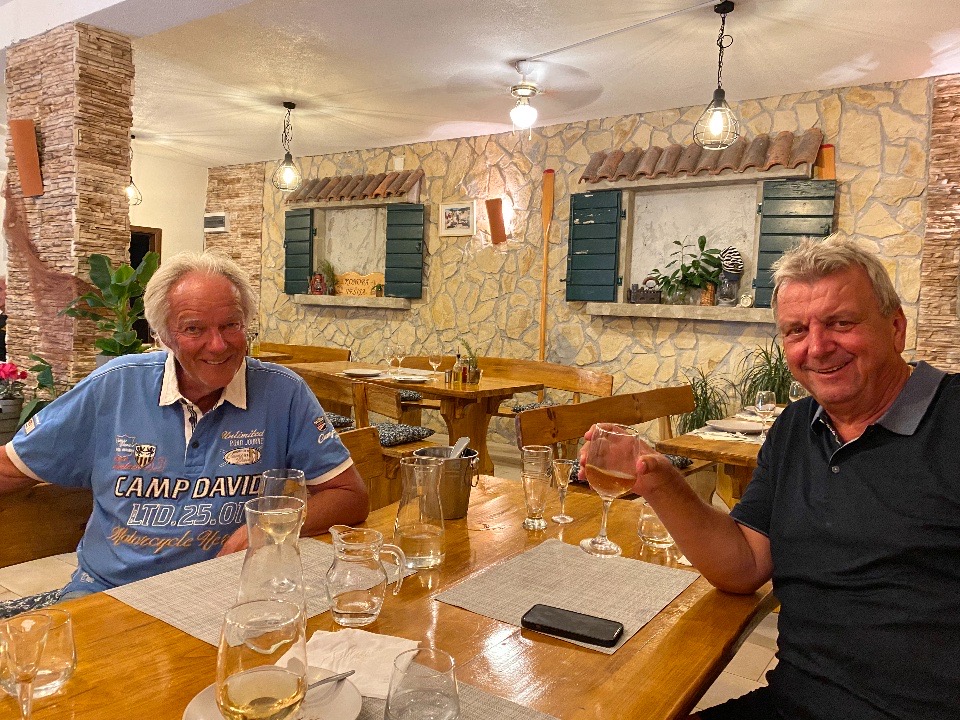 16.9.2025: Gerhard möchte gerne in Lastovo vorbeischauen, wo er mit seinem eigenen Boot schon öfter geankert hat. Wir entscheiden uns für die Skrivena, in der es zwei Lokale gibt. Hier entkommen wir den Nationalpark-Kassieren nicht. 85,- € für die Boje sind zu berappen. Das größere Lokal an der Westseite ist leider voll, das an der Ostseite die einzige Alternative. Von den Parkrangern vorgewarnt ob der Preise sind wir dann doch überrascht. Unfreundliche Bedienung, keine Speisekarte, minderwertiger Wein um 48,- die Flasche werden auch mit durchschnittlichem Fisch vom Grill, welcher unprofessionell tranchiert wird, nicht aufgewogen. Das erste enttäuschende Abendessen bei diesem Törn!